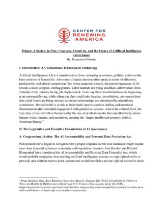 America faces a choice. We can allow copycat systems to dominate, entrusting society to mimicry, labor deprivation, and cultural erosion, or we can build a framework that protects human dignity. Several government policy fronts have already shown that accountability is possible. The task now is to extend those protections from government to all of society. The stakes are clear: AI is about not only efficiency or innovation but also whether technology our society or hollows it out.