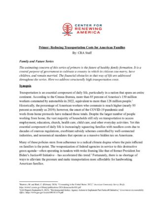 The animating concern of this series of primers is the future of healthy family formation. It is a central purpose of government to cultivate a country in which its citizens can marry, have children, and remain married. The financial obstacles to that way of life are addressed throughout the series. Here we address structurally high transportation costs.