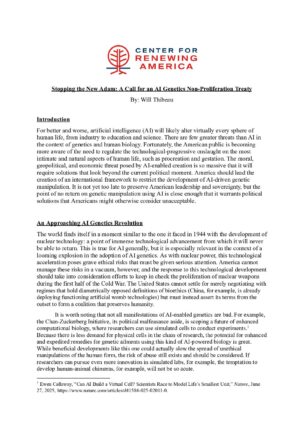 The world finds itself in a moment similar to the one it faced in 1944 with the development of nuclear technology: a point of immense technological advancement from which it will never be able to return. This is true for AI generally, but it is especially relevant in the context of a looming explosion in the adoption of AI genetics. As with nuclear power, this technological acceleration poses grave ethical risks that must be given serious attention. America cannot manage these risks in a vacuum, however, and the response to this technological development should take into consideration efforts to keep in check the proliferation of nuclear weapons during the first half of the Cold War. The United States cannot settle for merely negotiating with regimes that hold diametrically opposed definitions of bioethics (China, for example, is already deploying functioning artificial womb technologies) but must instead assert its terms from the outset to form a coalition that preserves humanity.